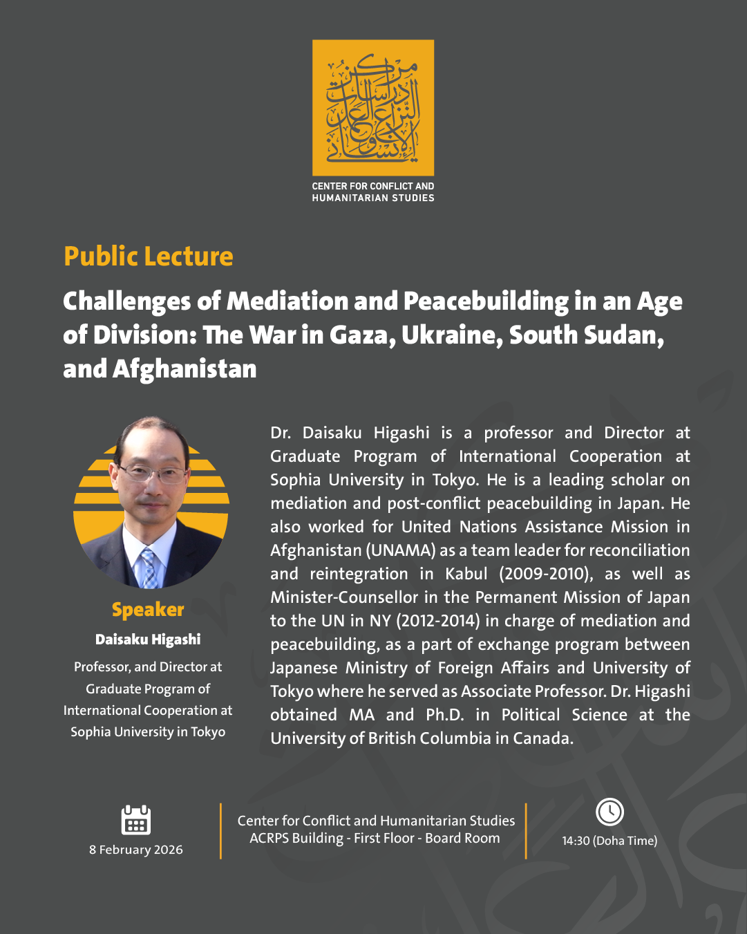 | 講演名 | 『分断の時代における和平調停と平和構築の課題:ガザ紛争、ウクライナ戦争、南スーダン内戦、アフガニスタン』 (英文タイトル:Challenges of Mediation and Peacebuilding in an Age of Division: The War in Gaza, Ukraine, South Sudan, and Afghanistan) |